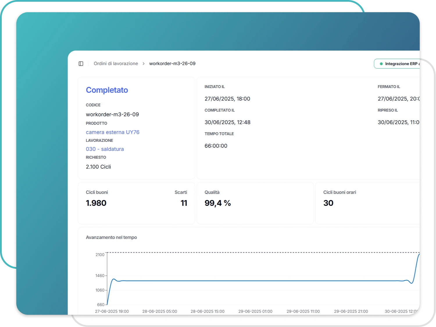 Work Orders Management ti aiuta a superare fogli di calcolo e sistemi frammentati, riunendo in un’unica piattaforma dati di produzione e sistemi gestionali. Con una vista integrata riduci incoerenze e duplicazioni e hai metriche sempre disponibili per guidare le decisioni.