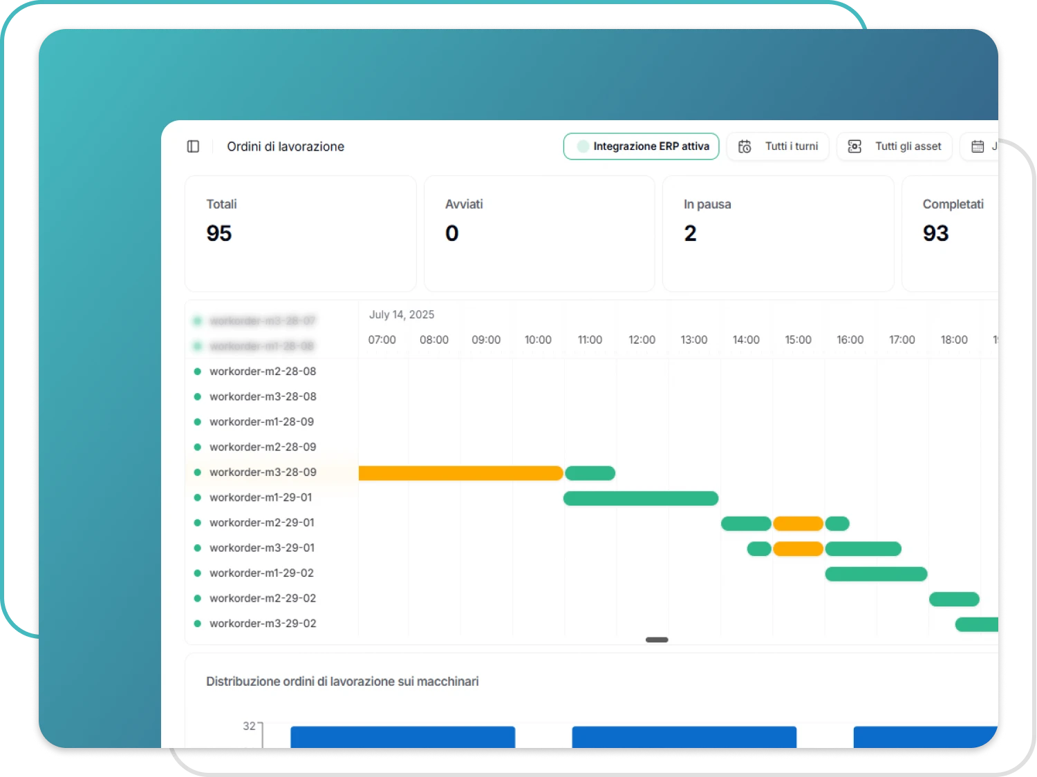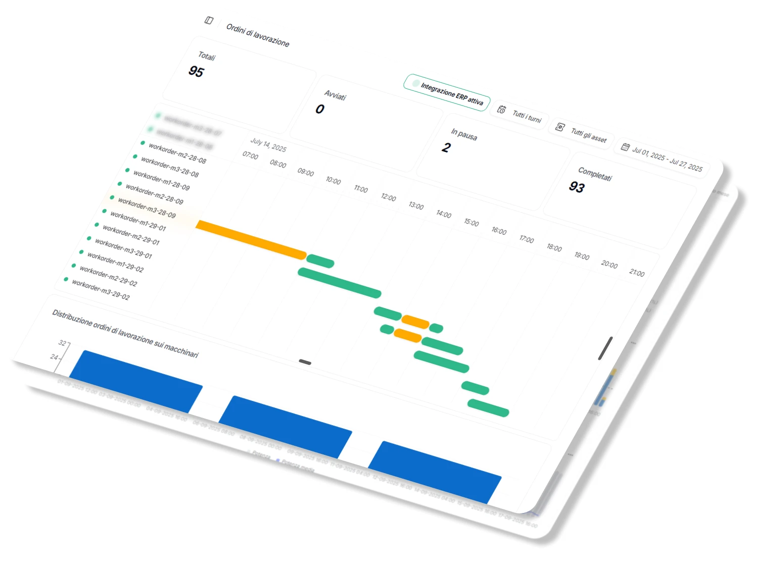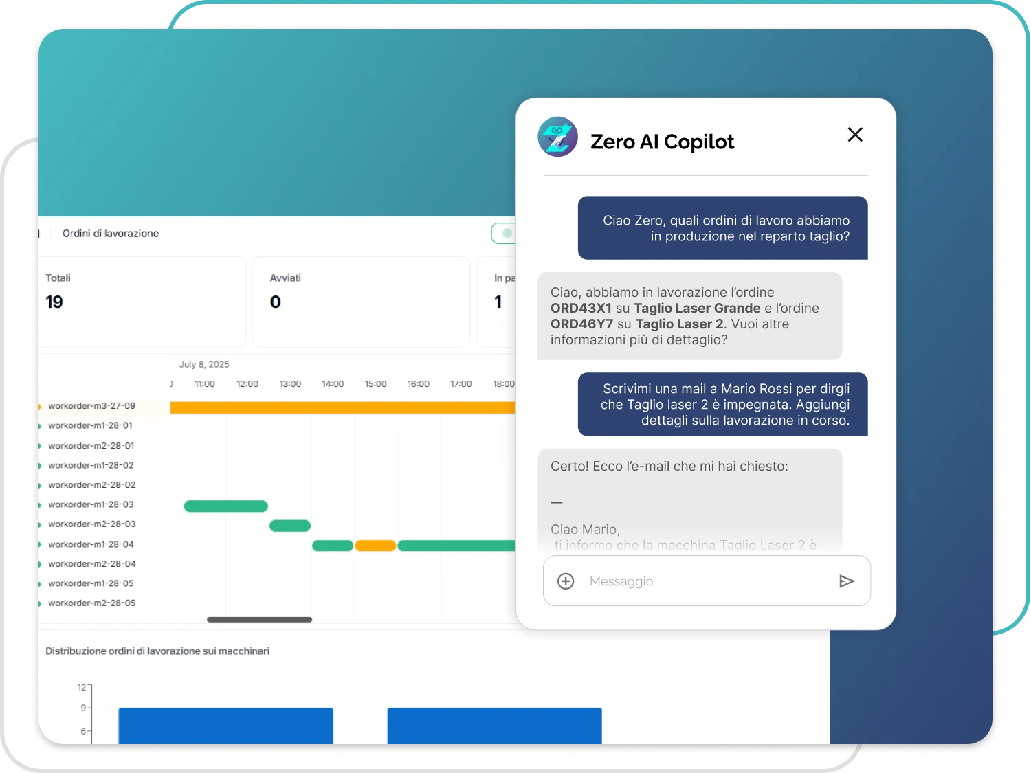 È qui che il Copilota AI entra in gioco come vero alleato decisionale: mappa i processi, integra i sistemi (MES, ERP, ecc.) e supporta la gestione avanzata degli ordini di lavoro, permettendoti di intervenire con tempestività e consapevolezza.