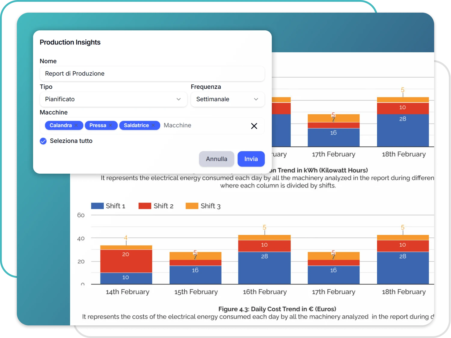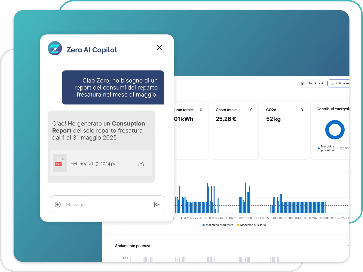 Trasforma i dati macchina in report sintetici e condivisibili, generabili direttamente dalla piattaforma o con l’AI Copilot Zero, per monitorare KPI, analizzare anomalie e supportare le decisioni.